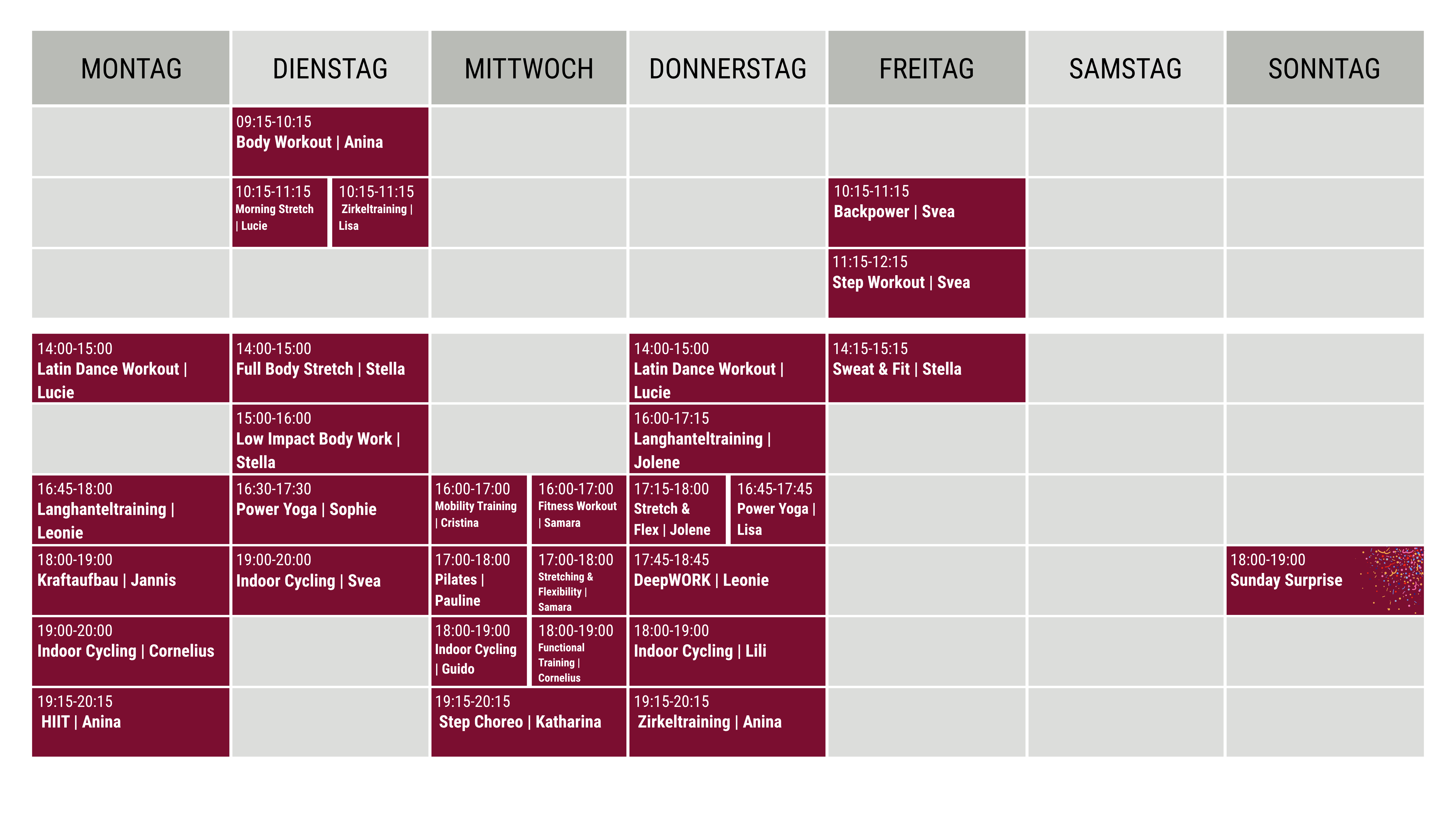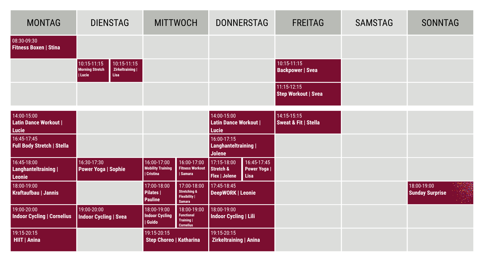- Mit der Buchung einer Groupfit-Card oder einer Fitness-Mitgliedschaft mit Groupfit-Option bist Du berechtigt, an allen Groupfitkursen im ganzen Programmzeitraum teilzunehmen.